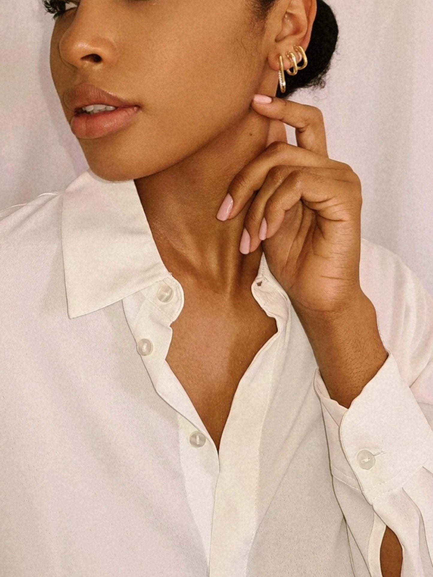 Glissez délicatement vos ear cuffs sur le lobe. Ne les étirez pas trop. Une pression excessive peut casser ou déformer le clip.
